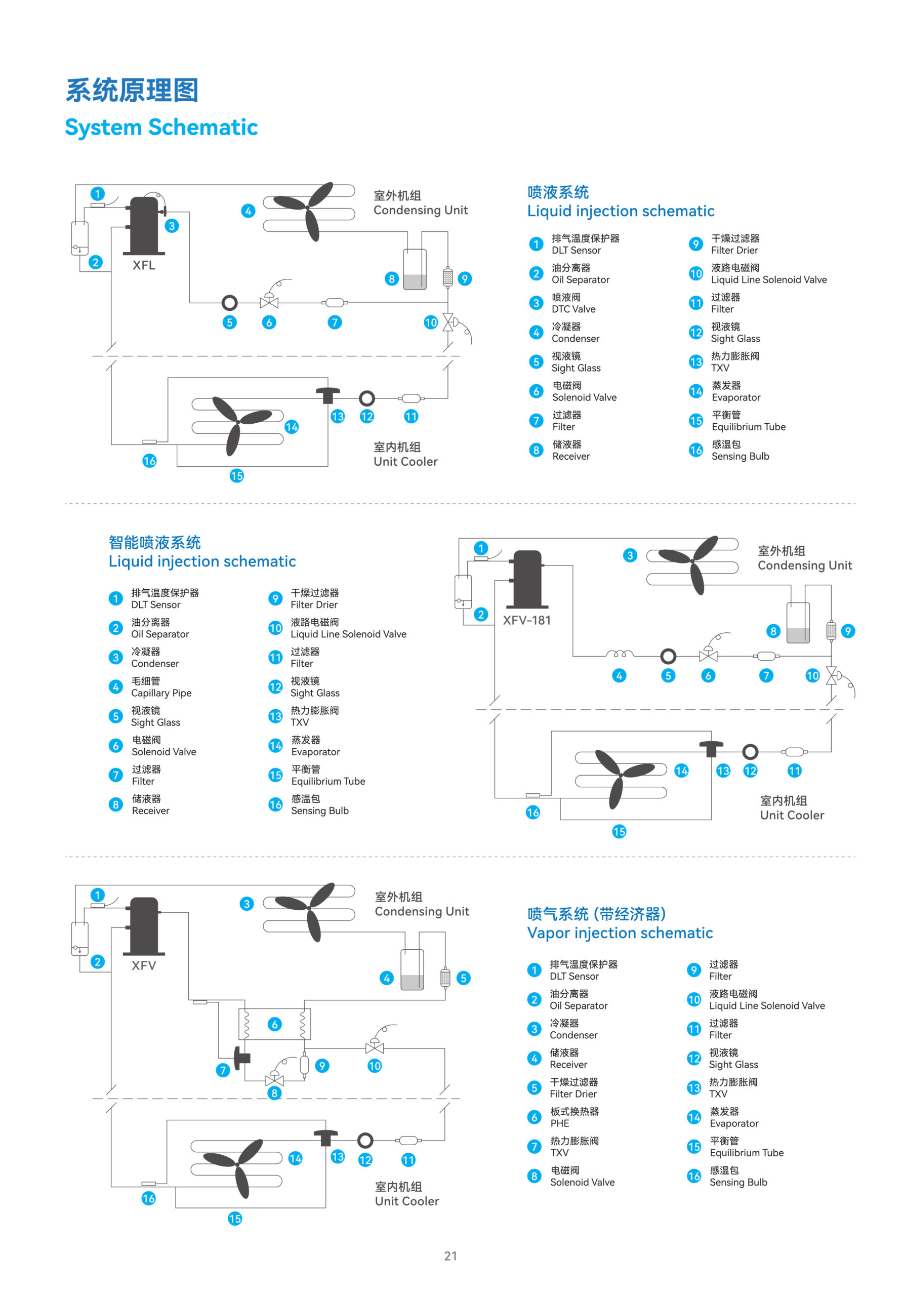 The KR/KF series scroll compressors adopt PDV intelligent exhaust technology and two-stage exhaust valve design, which significantly improves the partial load energy efficiency while effectively widening the operating range. The flexible use of liquid injection valve and jet enthalpy increase technology makes system design and engineering application easy. Many excellent features of SECWAY®️ scrolls, such as compact structure, smooth operation and stable and reliable operation, are also fully reflected in this series of products.