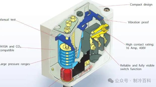 1. Suction and exhaust pressure controller: The suction and exhaust pressure control in the cold storage unit mainly relies on pressure controllers (also called pressure switches). These controllers monitor and adjust the system pressure to ensure the efficient and safe operation of the refrigeration system. When the exhaust pressure exceeds the preset maximum safety value, the controller activates a switch, which usually cuts off the power supply of the compressor and stops the compressor to prevent equipment damage or safety accidents caused by excessive pressure. When the pressure drops to a safe range, the controller restarts the compressor.